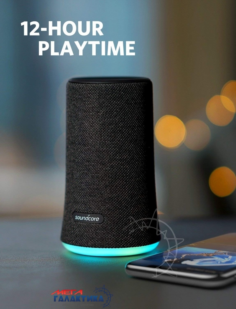 Anker SoundСore Flare - беспроводная портативная акустика с мигающей подсветкой в такт музыки. Колонка выдержит практически любые погодные условия, так как обладает защитой от влаги, поэтому вы смело можете брать ее с собой куда угодно. Автономность данной акустики составляет 12 часов.